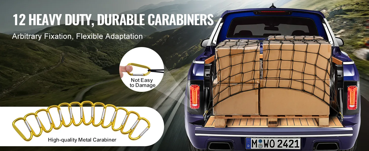 Our bungee cargo net is equipped with 12 heavy-duty durable carabiners. The multiple fixing points allow you to attach the cargo net to different locations in your vehicle or other spaces. You just need to snap and release the carabiners.