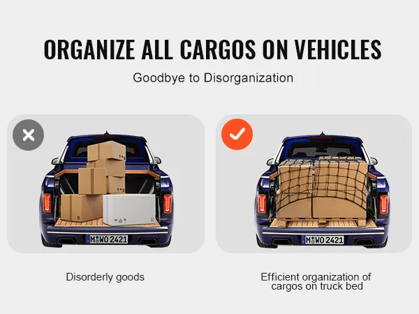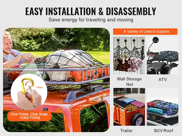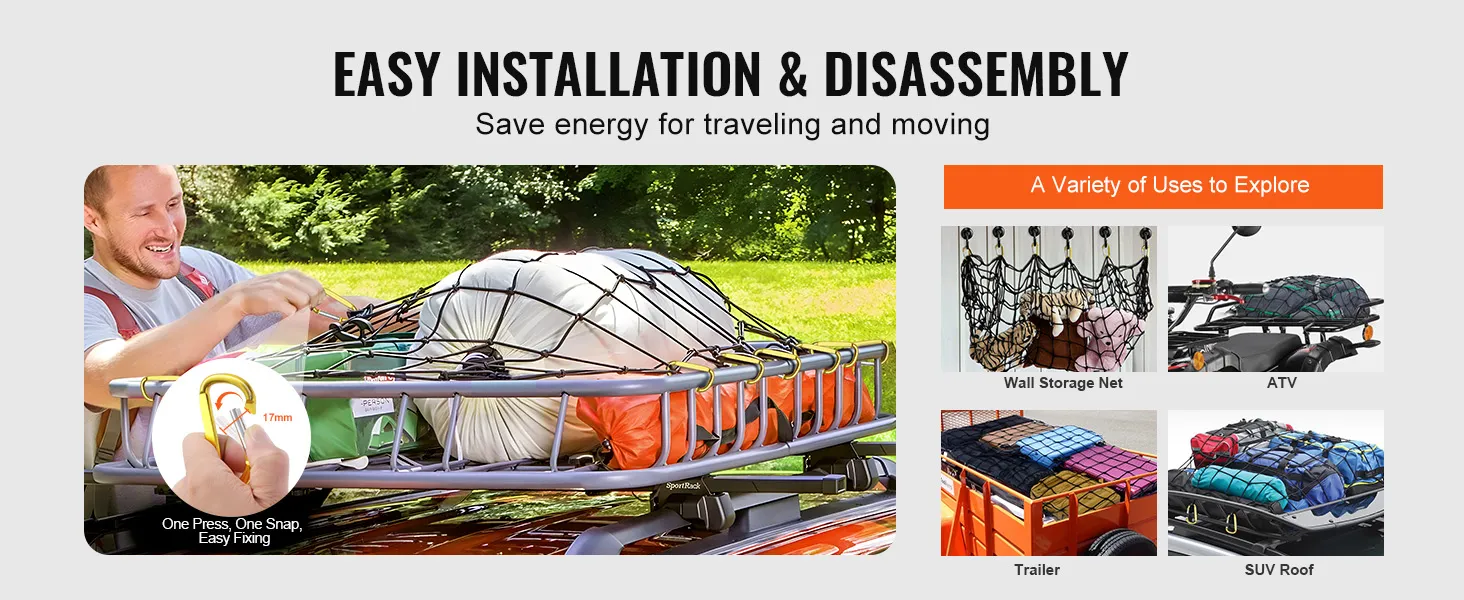 Easy Installation for Various Vehicles: By using the carabiners, you can easily fix the bungee net on the car or other fixed position. There are multiple uses waiting for you to explore, suitable for trucks, trailers, pickup trucks, jeeps, GMC, SUVs, ATVs/UTVs, boats, or oversized loads as a cargo net.