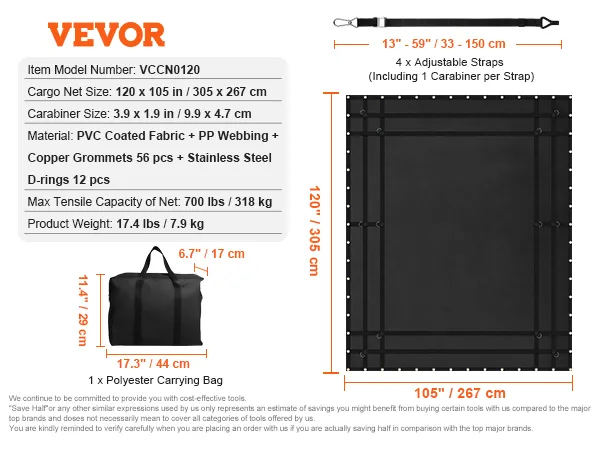 VEVOR bagagenet 3050 x 2670 mm: draagvermogen tot 318 kg
