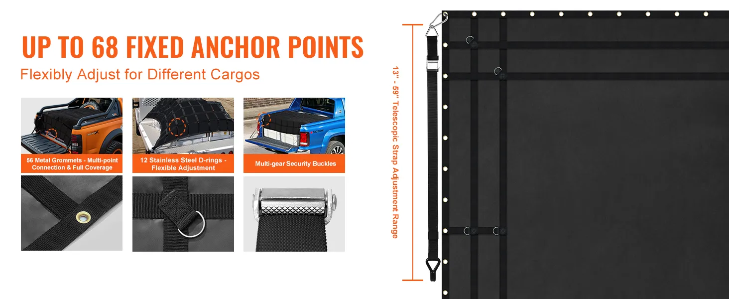 Flexibele aanpassing aan verschillende belastingen: het weerbestendige bagagenet van VEVOR heeft maximaal 68 metalen vaste punten, uitgerust met verstelbare riemen van 13 - 59 inch / 330 - 1500 mm en multi-speed gespen. Dit betekent dat u de meegeleverde metalen gespen kunt gebruiken om de ankerpunten indien nodig aan te passen aan verschillende maten en vormen van lading. Verbeterde multi-speed gespen kunnen de stabiliteit van de telescopische riemen verbeteren, zijn niet gemakkelijk los te maken en zijn zeer geschikt voor gebruik met zware of onregelmatige ladingen.