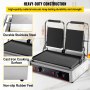 VEVOR panini-grill met roestvrijstalen, gietijzeren kookoppervlak en rubberen voetjes.