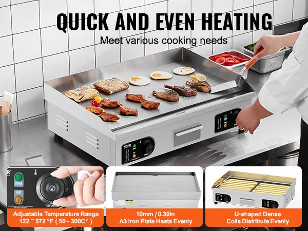 Even Heating: The commercial electric griddle features an upgraded thickened 10mm / 0.39in iron cooking plate. The U-shaped dense heating tubes are evenly distributed, ensuring uniform temperature across the entire grill. The high-power setting allows for rapid heating of food.