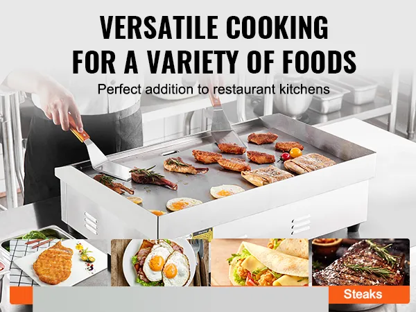 Wide Application: The electric commercial flat top grill is suitable for both home and commercial settings, such as restaurants, shops, roadside stands, and snack bars. It is perfect for preparing pancakes, crispy bacon, grilled cheese, hearty breakfasts, fried dishes, omelets, pizzas, steaks, and burgers.