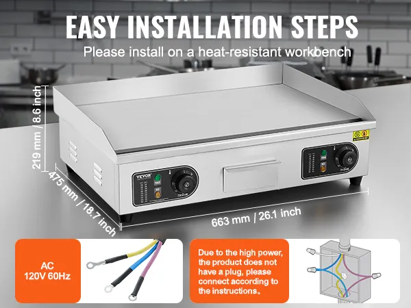 Please install the electric commercial griddle on a heat-resistant workbench, reserving enough space for the power cord.