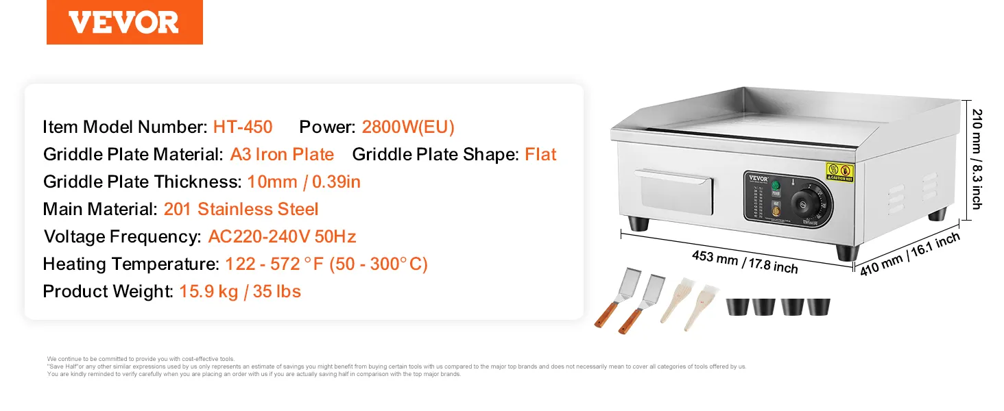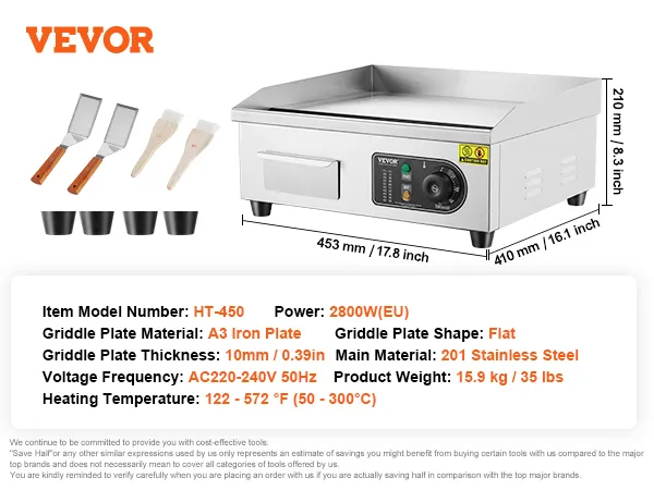 Spacious Cooking Area: Our commercial griddle boasts a high-quality A3 iron plate with a non-stick surface and cast iron cooking surface. The cooking surface measures 17.72 x 11.81 inches, providing ample cooking space at once. You can cook multiple dishes simultaneously on this griddle to meet your fast and high-volume demands.