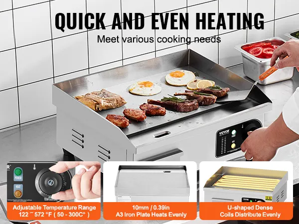 Even Heating: The commercial electric griddle features an upgraded thickened 10mm / 0.39in iron cooking plate. The U-shaped dense heating tubes are evenly distributed, ensuring uniform temperature across the entire grill. The high-power setting allows for rapid heating of food.