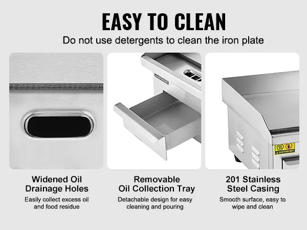 More Details: The widened oil drain hole of the flat top electric griddle helps remove waste oil. The oil collection tray gathers waste oil and food, making it easy to dispose of. Rubber feet make the griddle more stable. The raised oil baffle prevents oil splashes.