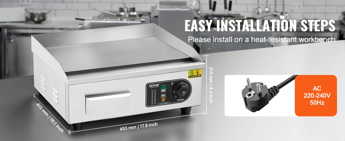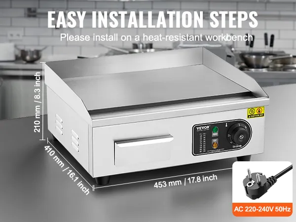 Please install the electric commercial griddle on a heat-resistant workbench, reserving enough space for the power cord.