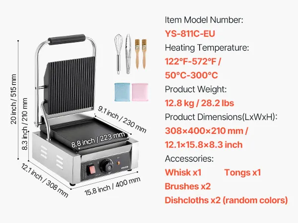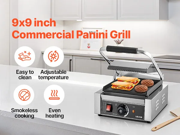 VEVOR Commerciële Contactgrill 1800W Elektrische Grill Sandwich Maker Paninipers Gemaakt van roestvrij staal met handvat en temperatuurregeling, 22 x 23 cm Platte geëmailleerde plaat (enkel), voor hamburger, steak en spek