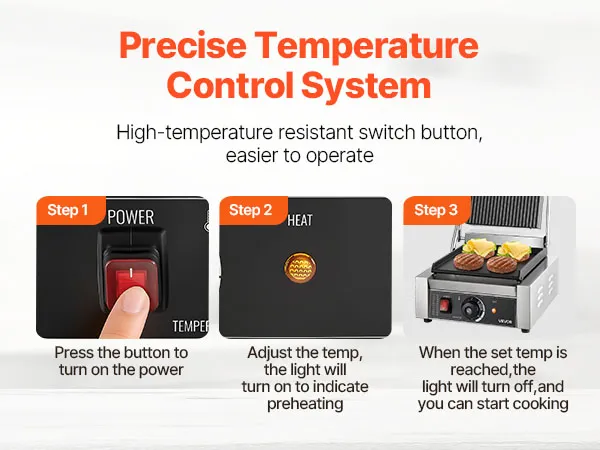 Nauwkeurige temperatuurregeling: De contactgrill is voorzien van draaiknoppen voor temperatuurregeling, instelbaar van 50 °C tot 300 °C (122 °F tot 572 °F). Dit ontwerp voldoet aan de kookbehoeften van diverse gerechten. Het ledlampje geeft de verwarmingsstatus aan.