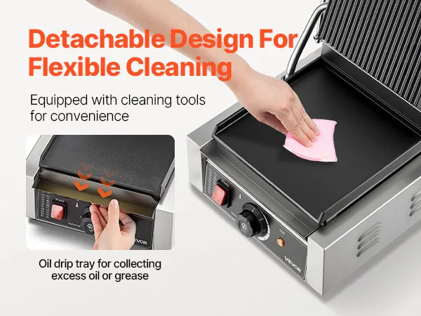 Gemakkelijk schoon te maken: Dit panini-sandwichapparaat is voorzien van een uitneembare olieopvangbak voor het eenvoudig opvangen van gebruikte olie en resten. Onderhoud is eenvoudig met een schraper en een droge doek. Meerdere ventilatiesleuven aan beide zijden voeren warmte effectief af.