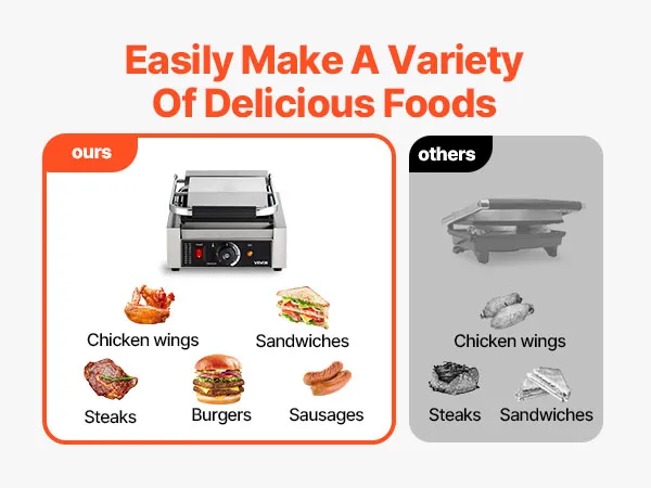 Onze professionele panini-grill is multifunctioneel en geschikt voor het bereiden van diverse gerechten. Ideaal voor familiebijeenkomsten, foodstands, restaurants en meer. Hij biedt een veelzijdige kookervaring en het compacte formaat biedt voldoende grillruimte zonder veel ruimte op uw aanrecht in te nemen.