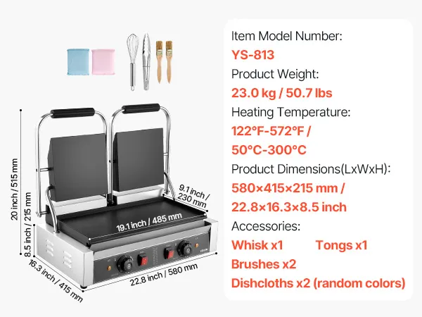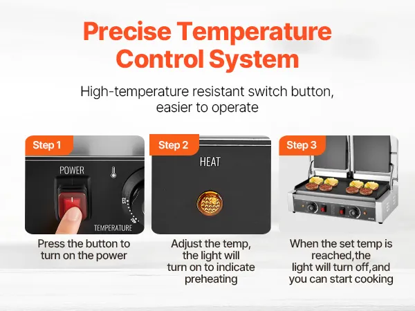 Nauwkeurige temperatuurregeling: Onze contactgrill is voorzien van draaiknoppen voor de temperatuurregeling. De temperatuur is instelbaar van 50 °C tot 300 °C (122 °F tot 572 °F). Dit ontwerp voldoet aan de kookbehoeften van diverse gerechten. Een ledlampje geeft de verwarmingsstatus aan.