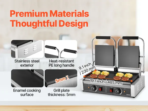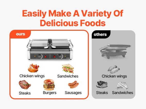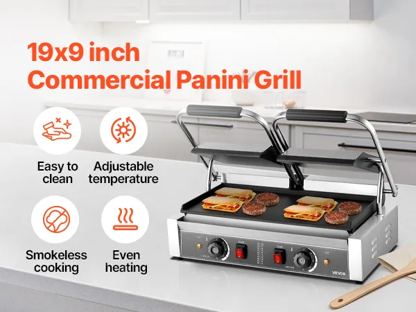 Onze professionele panini-grill is geschikt voor het bereiden van diverse gerechten, waardoor hij multifunctioneel is en ideaal voor familiebijeenkomsten, eetkraampjes, restaurants en meer. Hij biedt een veelzijdige kookervaring en dankzij het compacte formaat biedt hij voldoende kookruimte zonder veel ruimte op uw aanrecht in te nemen.