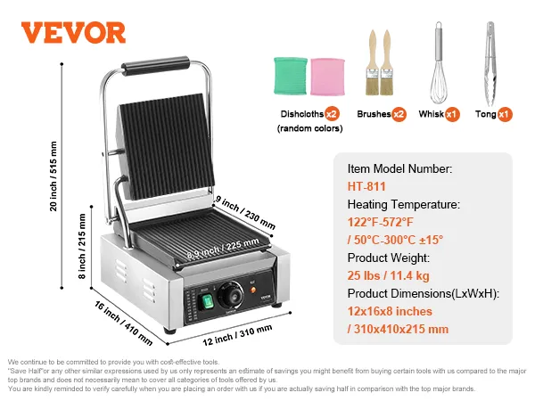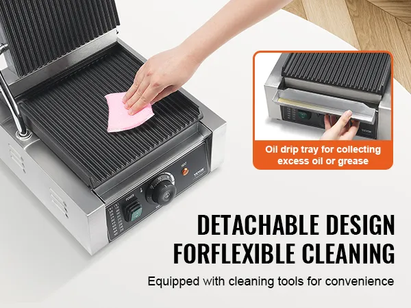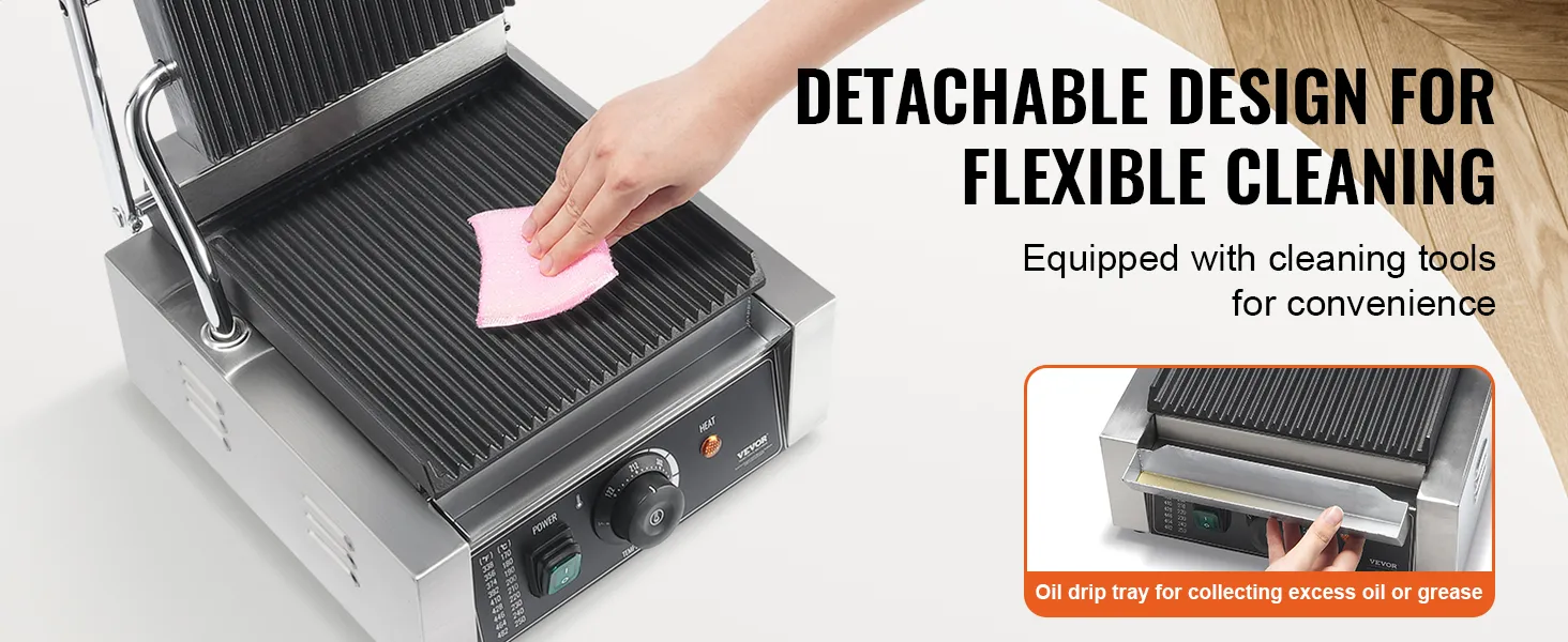 Easy to Clean: This panini press sandwich maker comes with a removable oil tray to easily collect waste oil and residues. Maintenance is simple with a scraper and dry cloth. Multiple vents on both sides effectively dissipate heat and help maintain a reasonable temperature for the machine.