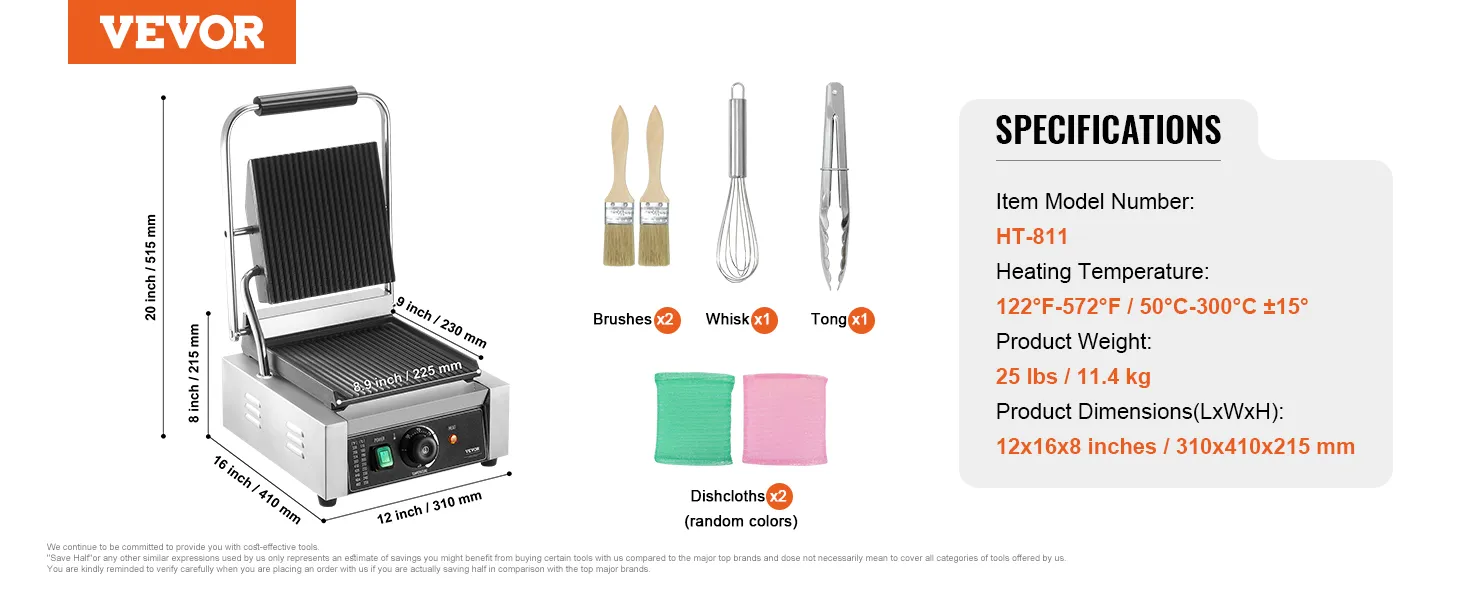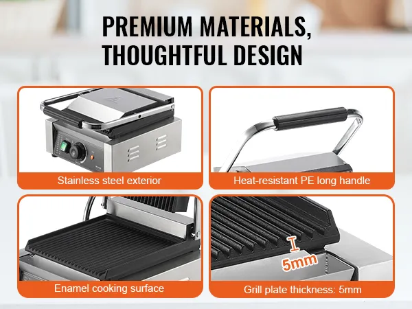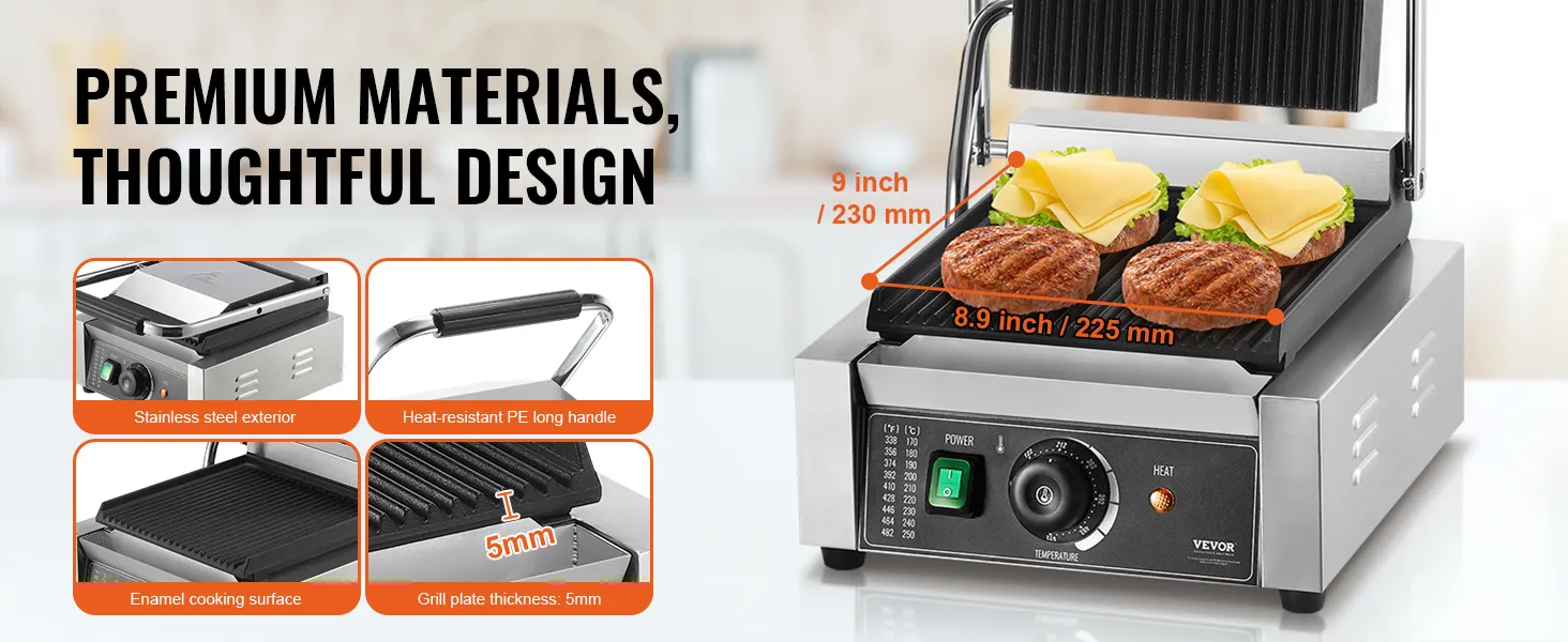 Durable and Long-lasting: This commercial panini grill features a stainless steel exterior and a thickened grill plate with an enamel coating, making it rust-proof, moisture-proof, and heat-resistant. It offers lasting durability and performance. The extended ABS handle effectively prevents burns, and the non-slip feet provide added safety.