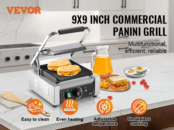 Multifunctional Grill: This panini grill machine can cook multiple foods simultaneously, making it ideal for cooking vegetables, meats, grilled cheese, scrambled eggs, panini sandwiches, burgers, chicken, full breakfasts, steaks, and more.