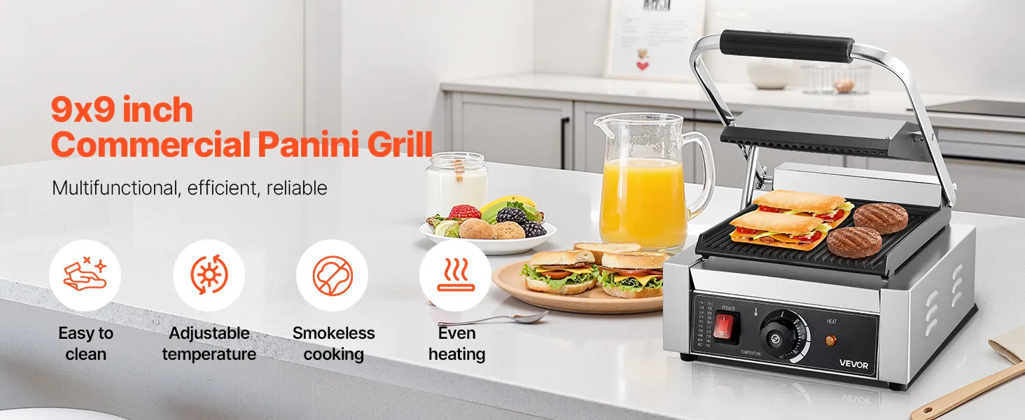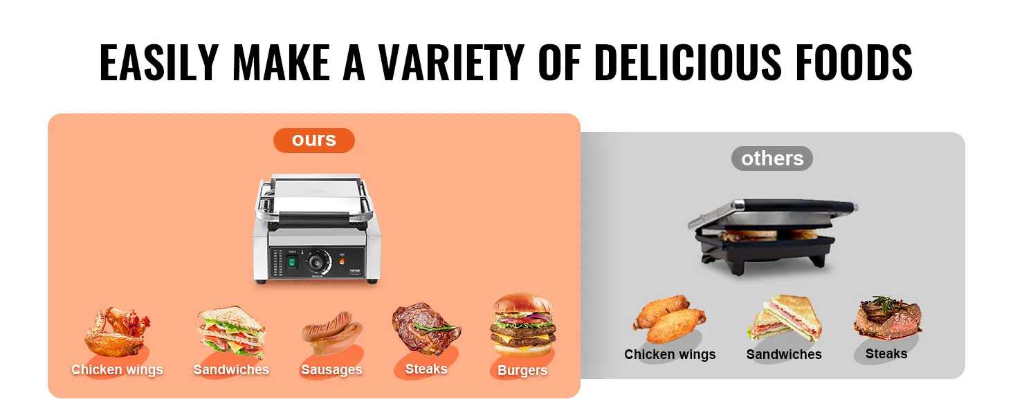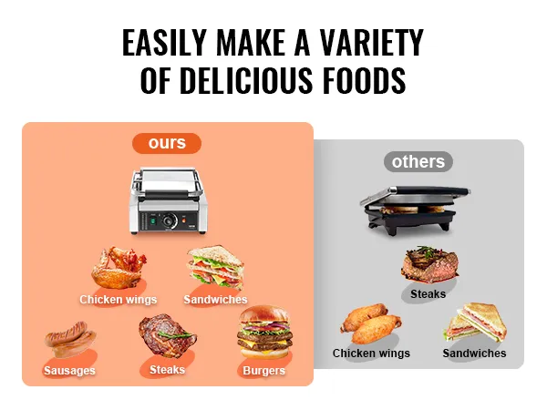 Our commercial panini grill can cook multiple foods, making it multifunctional to meet various needs for family gatherings, food stalls, restaurants, and more. It offers a versatile cooking experience while its compact grill size provides ample cooking surface without taking up much counter space.