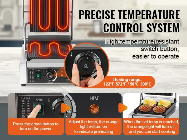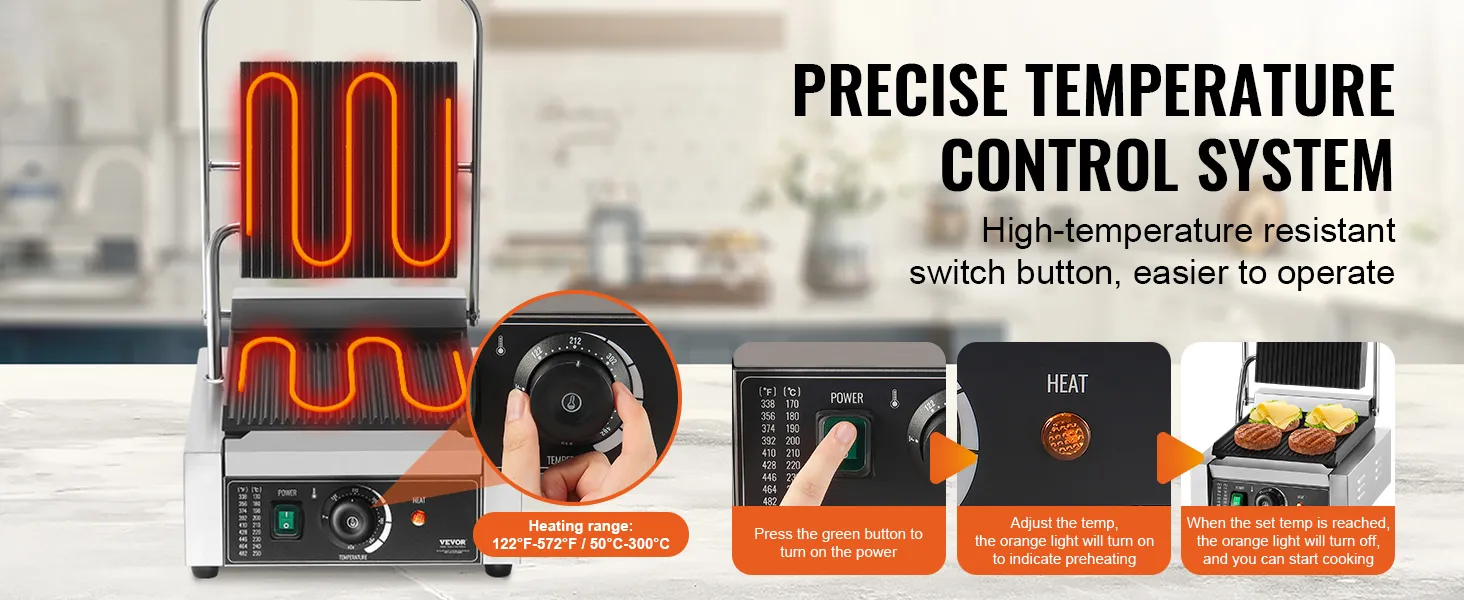 Precise Temperature Control: The commercial sandwich press grill is equipped with high-temperature-resistant knobs for precise temperature control, adjustable from 50°C-300°C (122°F-572°F). This allows you to adjust the grill's temperature to meet the cooking requirements of different foods. The LED light indicates the heating status, making operation simple and convenient.
