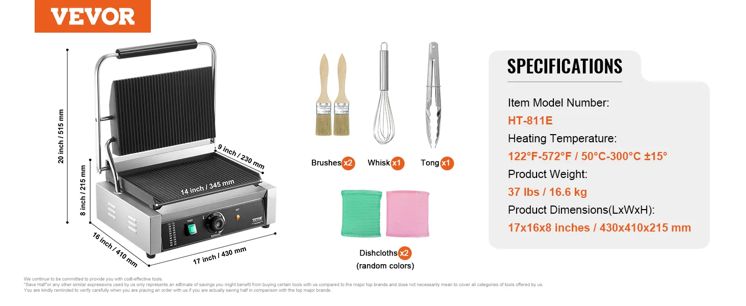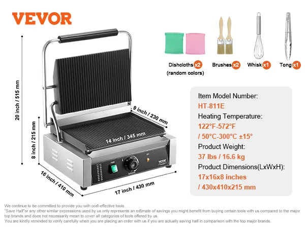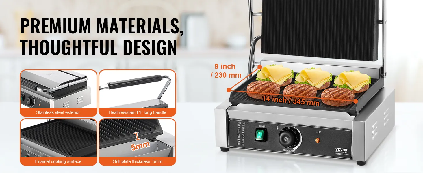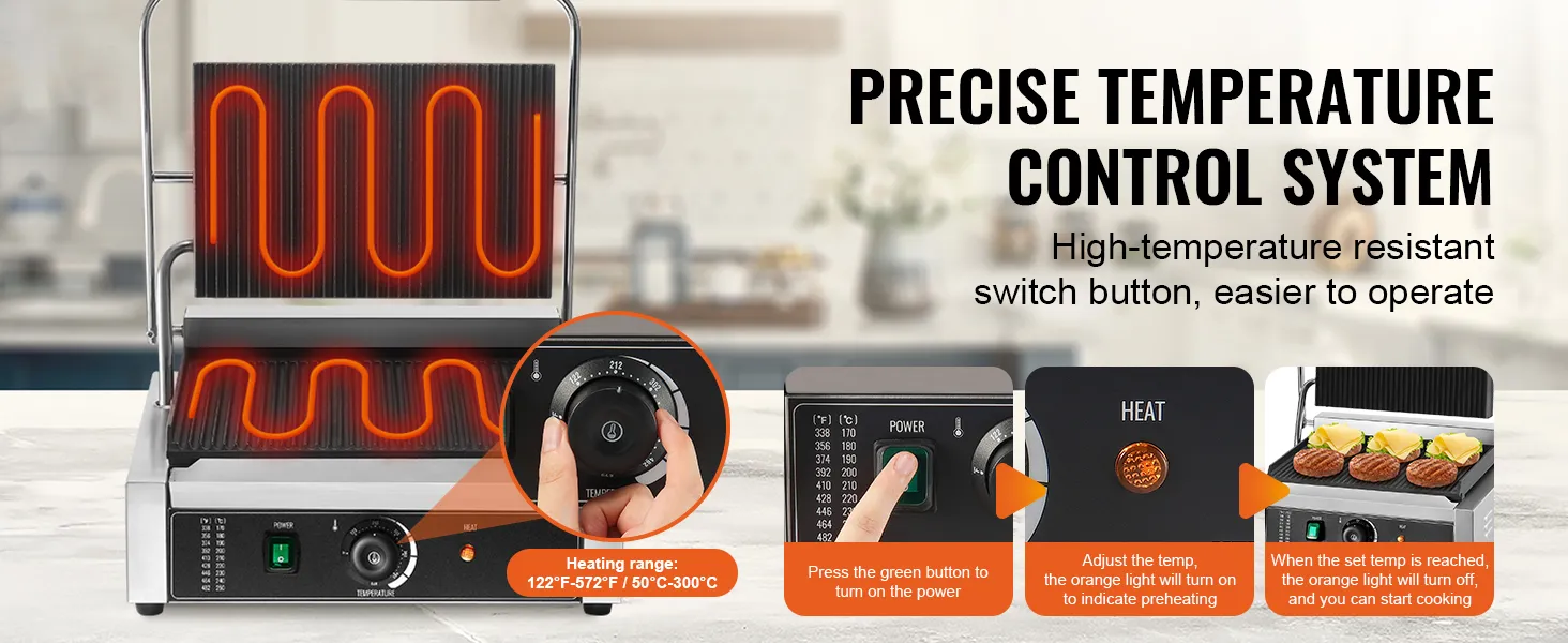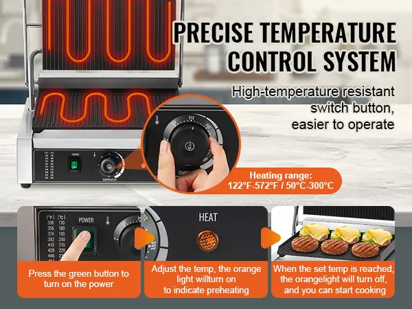 Nauwkeurige temperatuurregeling: de commerciële sandwichpersgrill is uitgerust met hittebestendige knoppen voor nauwkeurige temperatuurregeling, instelbaar van 50 °C tot 300 °C (122 °F tot 572 °F). Hierdoor kan de temperatuur van de grill worden aangepast aan de kookbehoeften van verschillende soorten voedsel. Het LED-lampje geeft de verwarmingsstatus aan en maakt de bediening eenvoudig en handig.