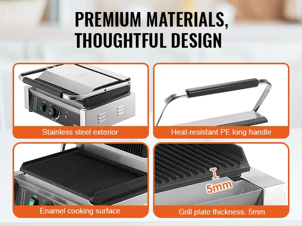 Stevig en duurzaam: deze commerciële panini-grill heeft een roestvrijstalen buitenkant en een dikkere geëmailleerde grillplaat die roestvrij, vocht- en hittebestendig is. Het is duurzaam en krachtig. De verlengde ABS-handgreep voorkomt effectief brandwonden en de antislipvoetjes zorgen voor extra veiligheid.