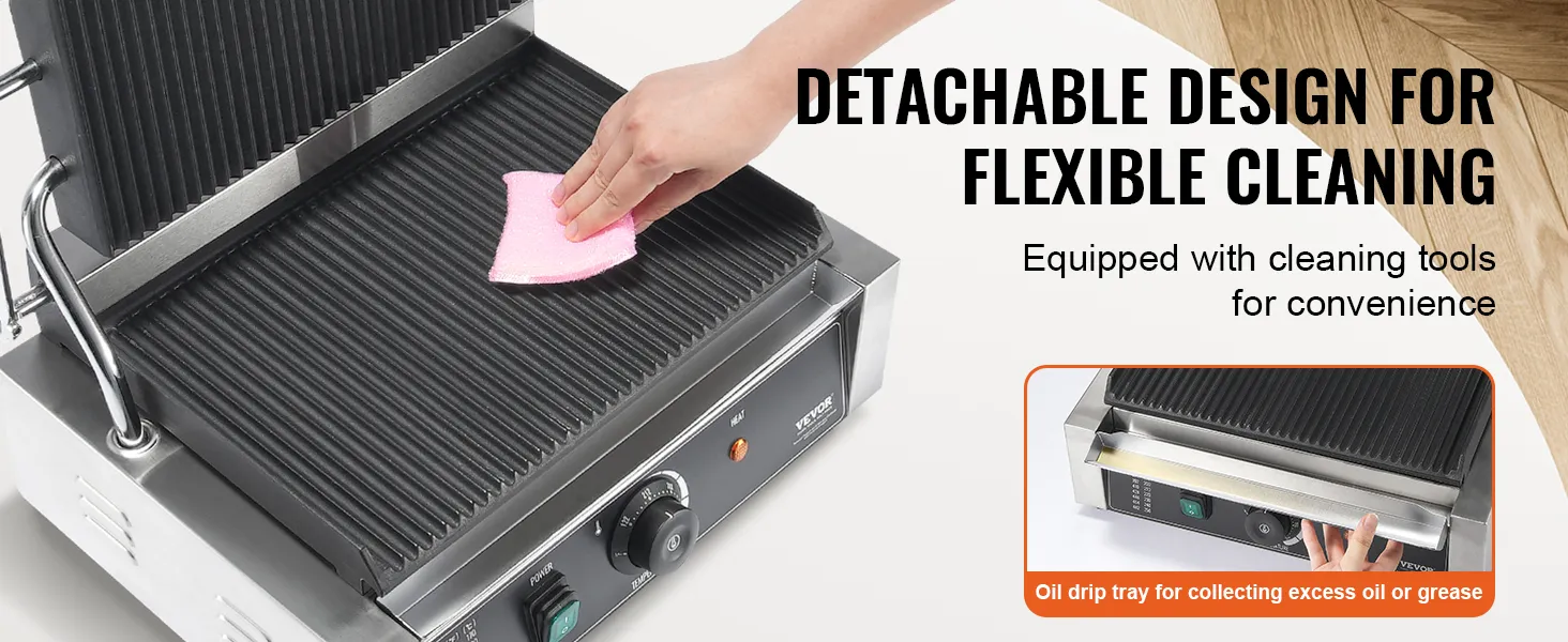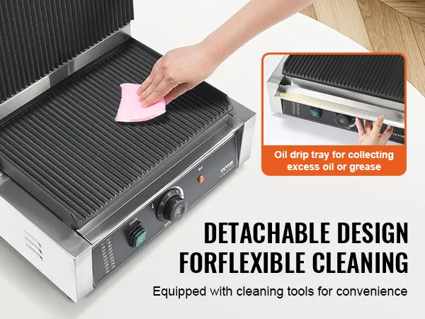 Het roestvrijstalen elektrische tosti-ijzer is uitgerust met een uitneembare lekbak die vet, olie of andere resten die van de kookplaat druipen opvangt, waardoor het schoonmaken eenvoudiger wordt.
