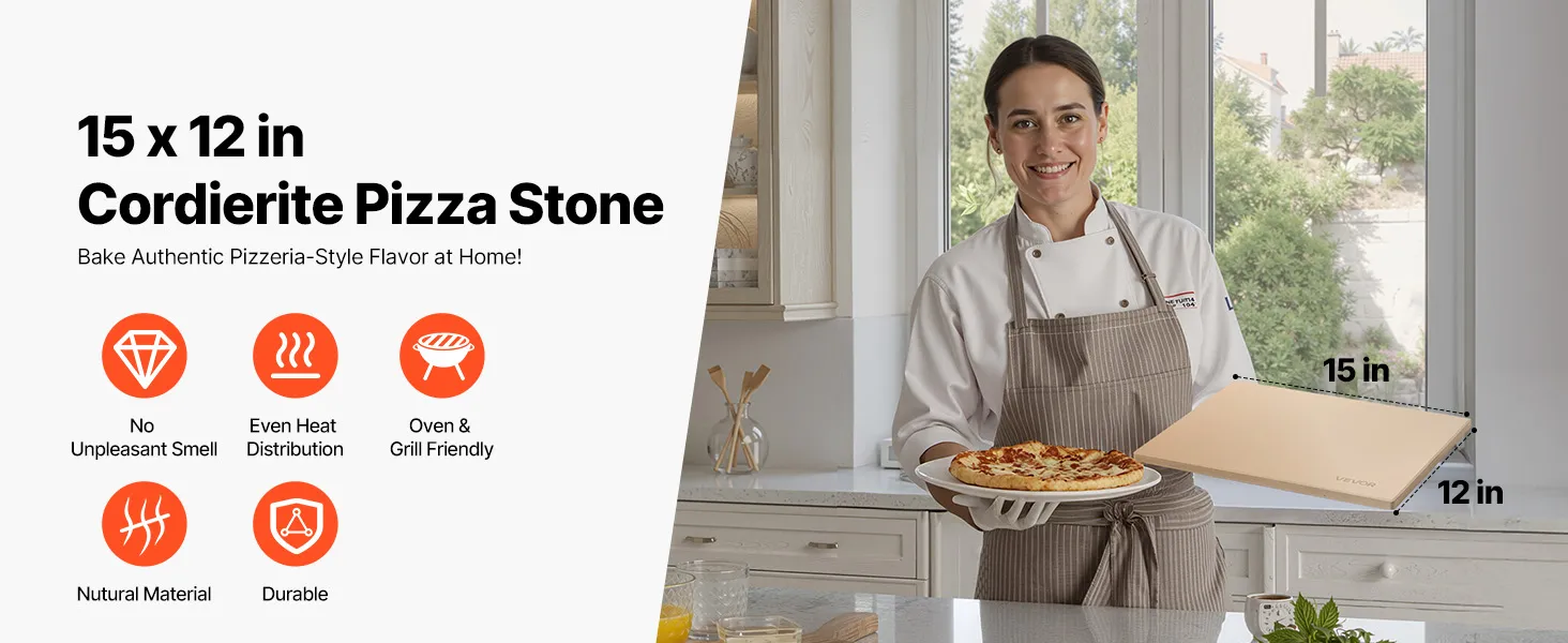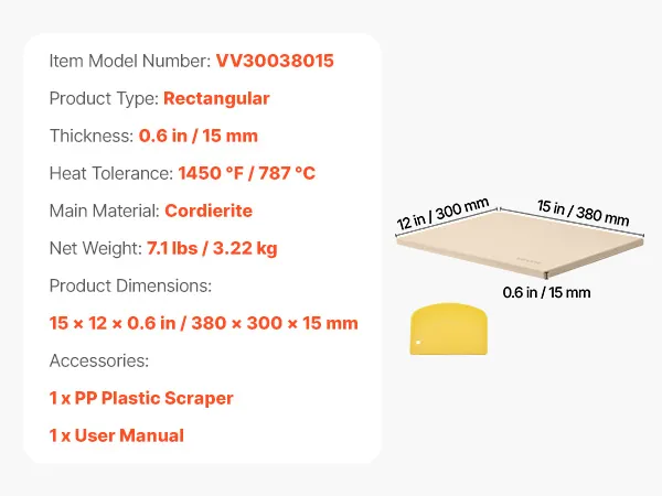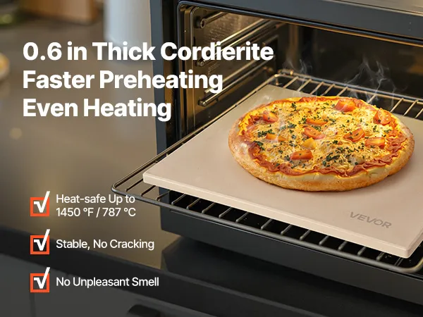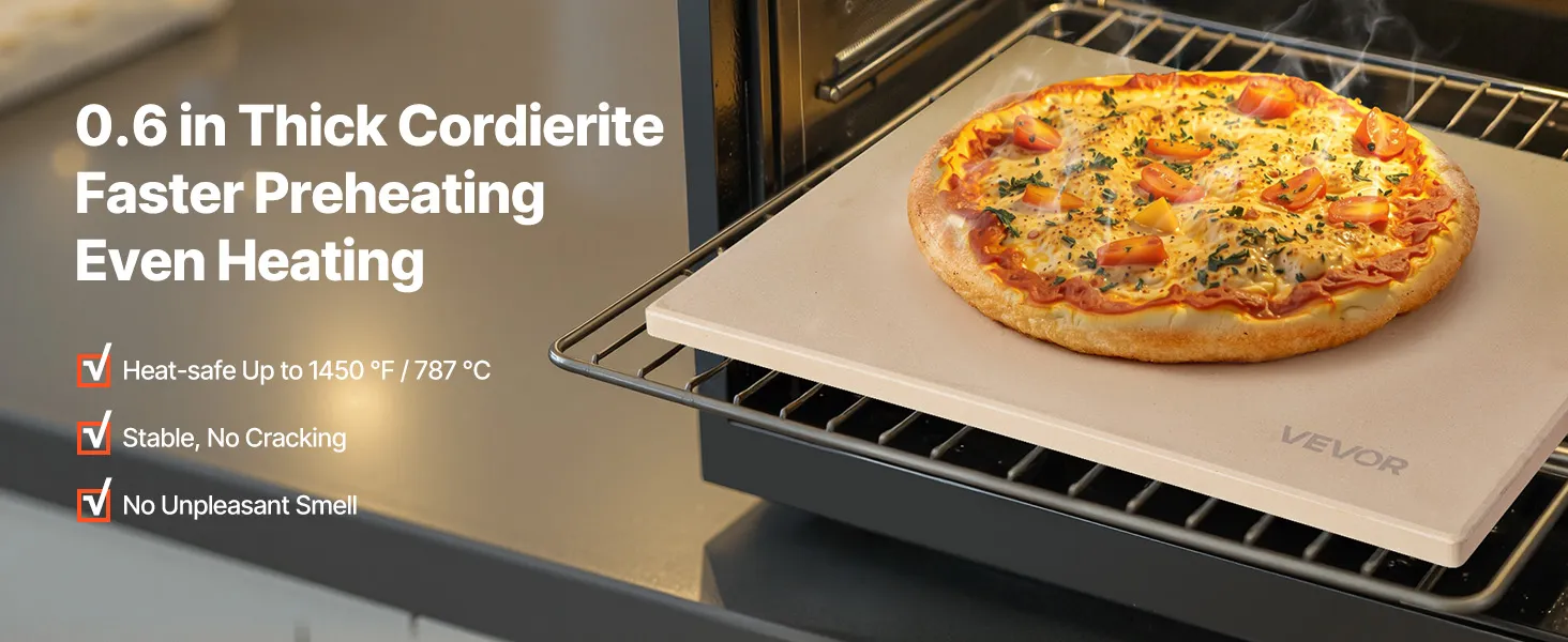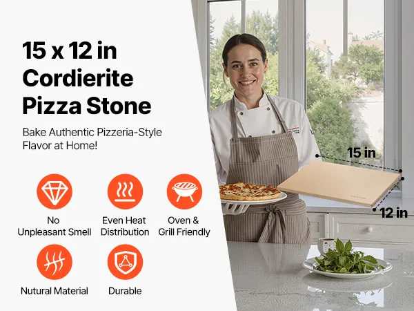 Hittebestendig cordieriet: Onze rechthoekige pizzasteen, gemaakt van 1,5 cm dik cordieriet, is bestand tegen temperaturen tot 787 °C zonder te kromtrekken of te barsten. De steen houdt de warmte langer vast, waardoor de voorverwarmtijd korter is. Geen onaangename geurtjes tijdens het bakken; de originele smaak blijft behouden.