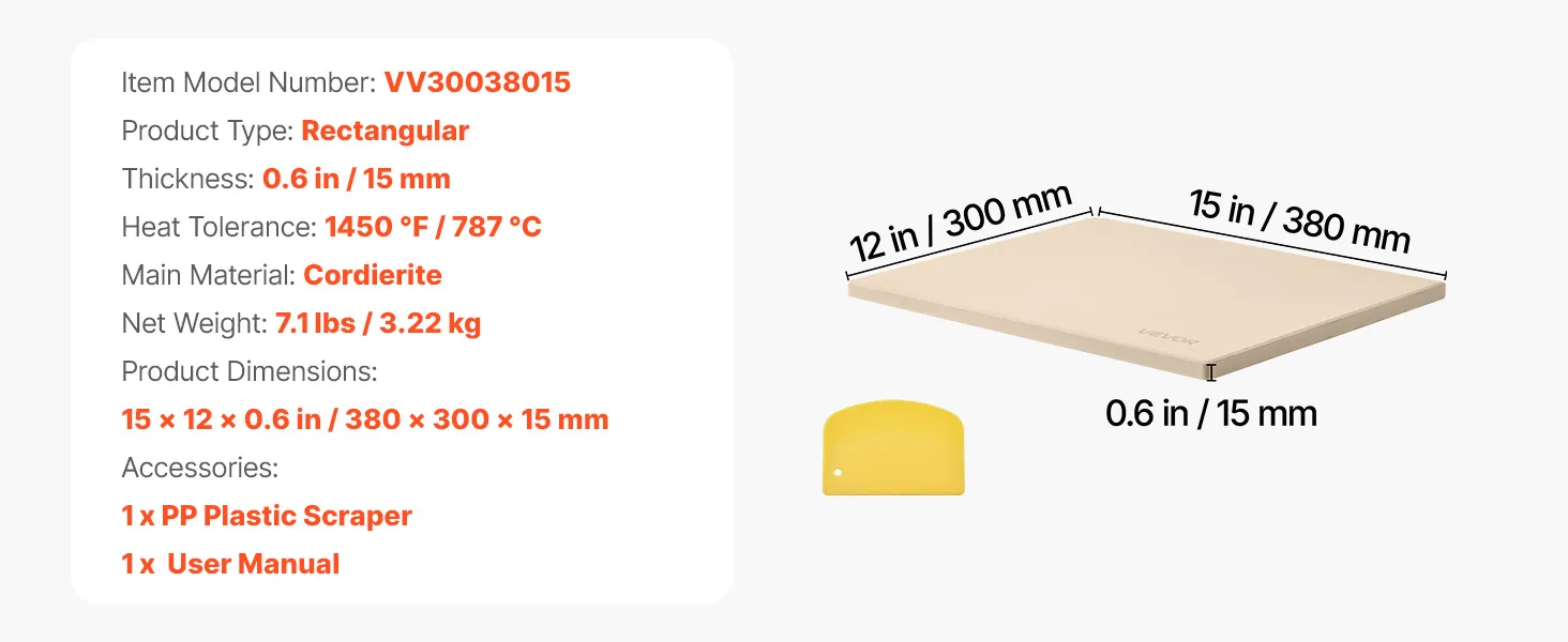 VEVOR Pizzasteen Baksteen 38 x 30 cm, rechthoekige cordieriet pizzasteen, extra grote steenplaat met schraper, 1,5 cm dik, hittebestendig, geschikt voor keukenovens, broodbakken, pizzabakken en grillen