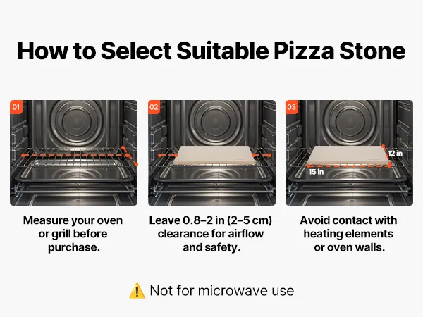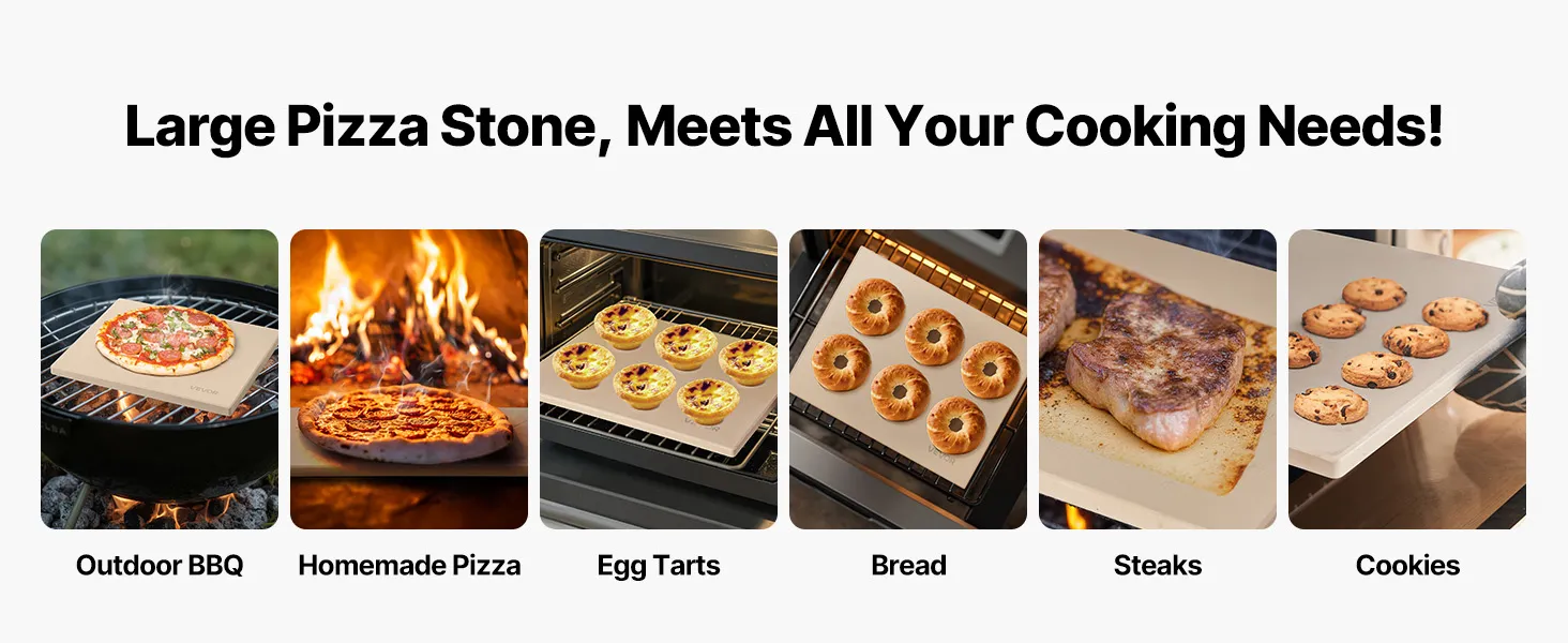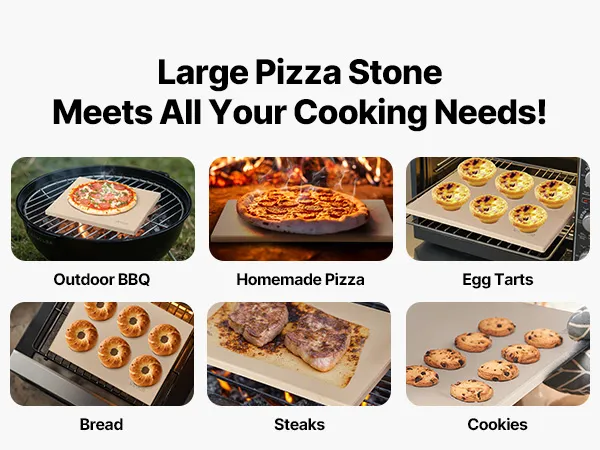 Veelzijdig gebruik: Deze grote stenen plaat past in ovens, houtskoolgrills, barbecues en steenovens. Hij is perfect voor het bakken van knapperige pizza's, gebak en brood, of voor het opwarmen van eten om de knapperigheid te herstellen – ideaal voor thuis koken, buiten grillen en feestjes. Opmerking: Meet de binnenkant van uw grill en oven op om de juiste maat te kiezen, en zorg voor een minimale vrije ruimte van 2-5 cm aan alle kanten.