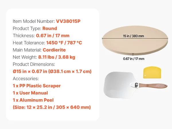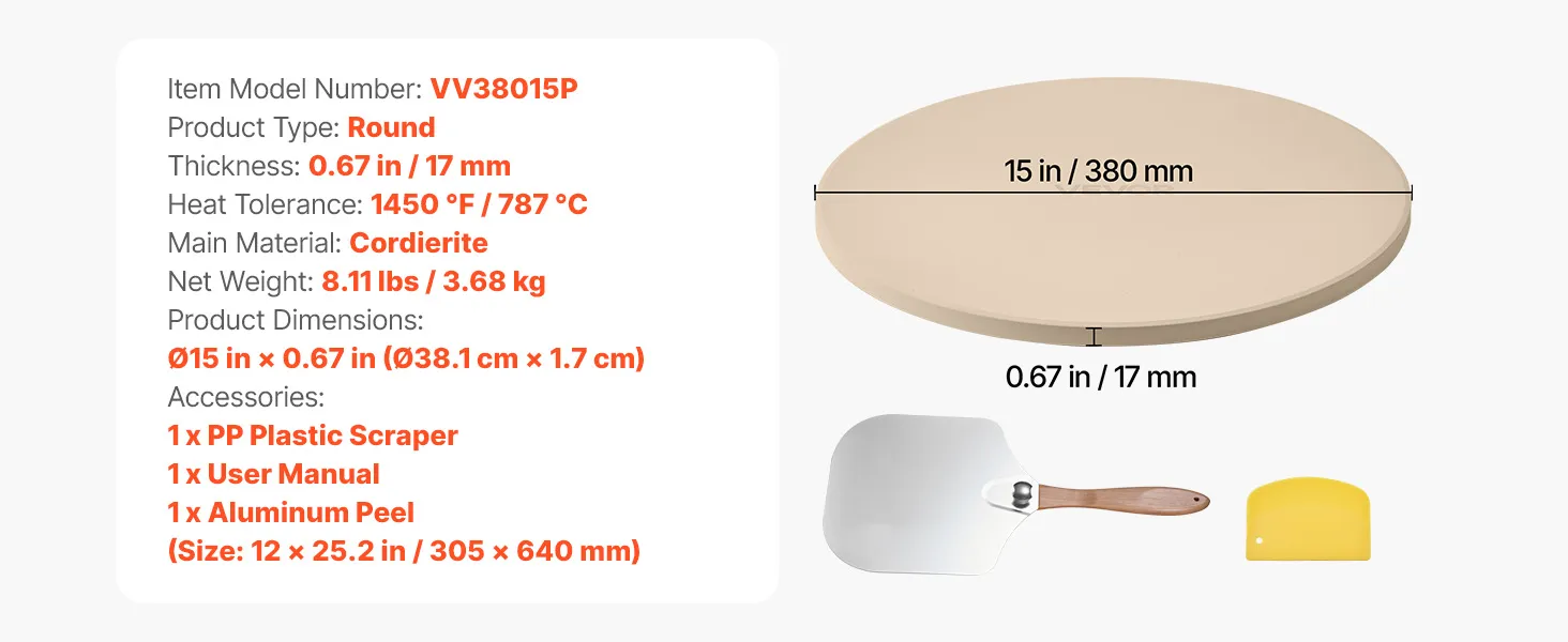 VEVOR Pizzasteen Baksteen 381 x 381 mm, Ronde Cordieriet Pizzasteen, Grote Steenplaat met Schraper en Aluminium Schil, 17 mm Dik, Hittebestendig, Geschikt voor Keukenovens, Broodbakken en Pizzabakken