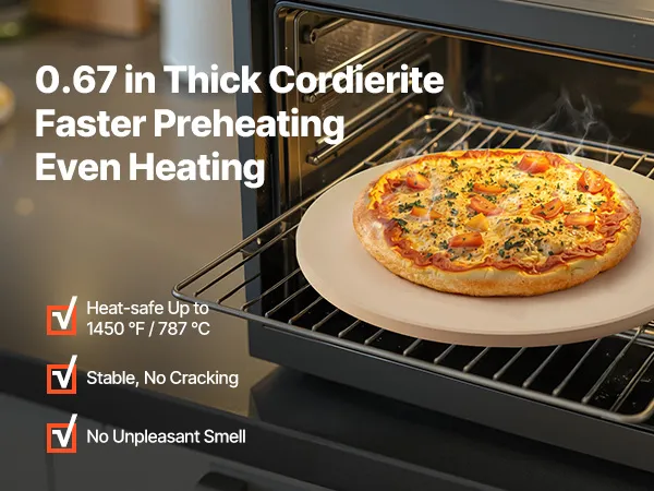 De ronde pizzasteen is gemaakt van verdikt cordieriet en is hittebestendig tot 787 °C. Hij houdt de warmte lang vast en verdeelt deze gelijkmatig. Dit voorkomt een slappe pizza en gedeeltelijk aangebrande plekken en verbetert het bakresultaat.