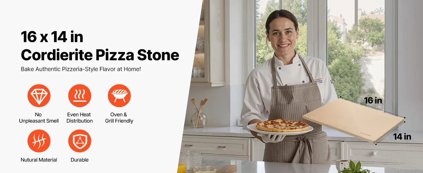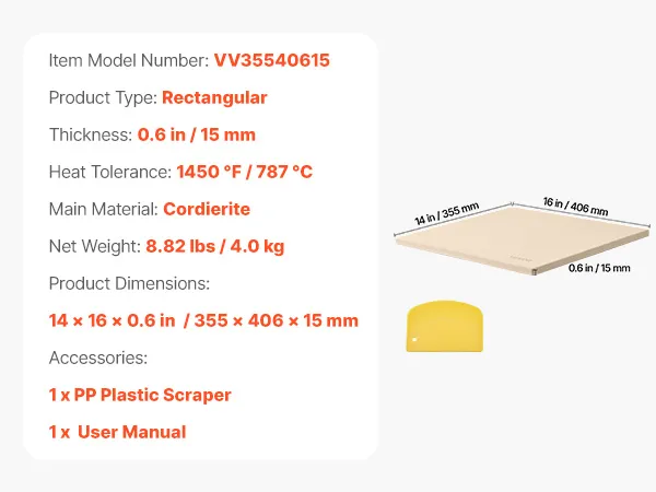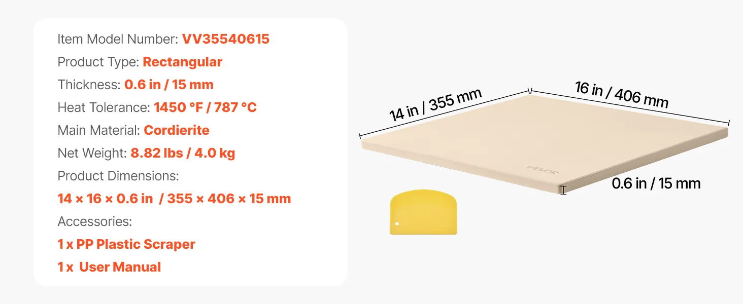 VEVOR Pizzasteen Baksteen 406 x 355 mm, rechthoekige cordieriet pizzasteen, grote steenplaat met schraper, 1,5 cm dik, hittebestendig, geschikt voor keukenovens, broodbakken, pizzabakken en grillen