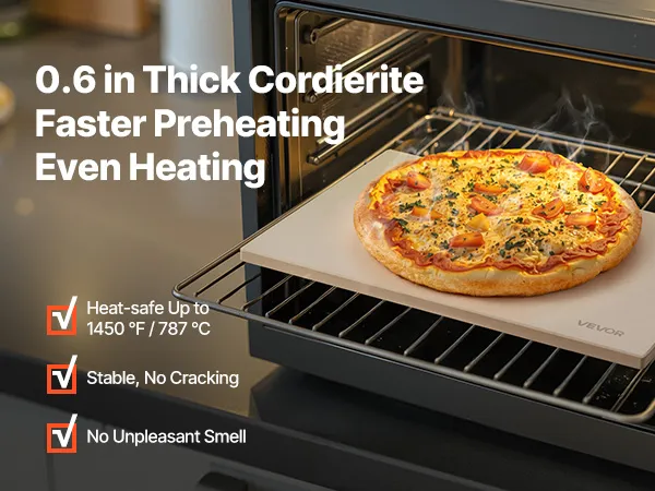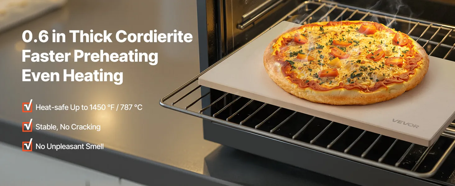 Hittebestendig cordieriet: Onze rechthoekige cordieriet pizzasteen van 15 mm dik is bestand tegen temperaturen tot 787 °C zonder te kromtrekken of te barsten. Hij houdt de warmte langer vast en verkort de voorverwarmtijd. Geen onaangename geurtjes tijdens het bakken.