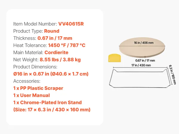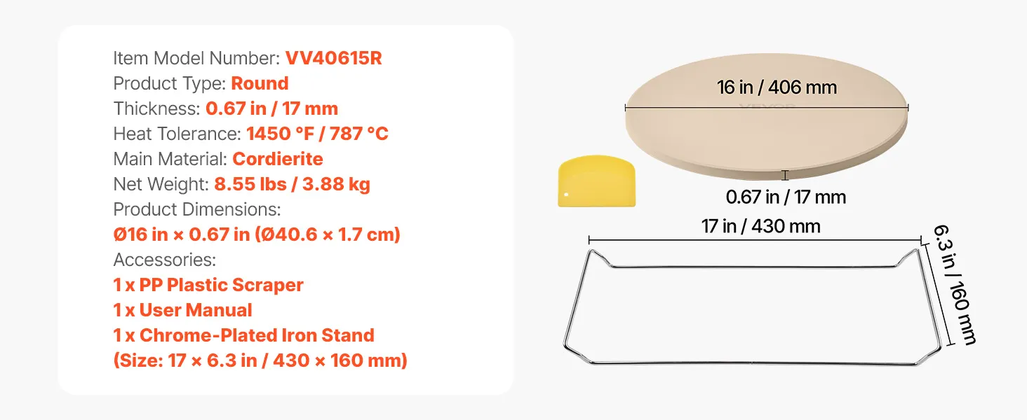 VEVOR Pizzasteen Baksteen 406 x 406 mm, Ronde Cordieriet Pizzasteen, Extra Grote Steenplaat met Schraper & Standaard, 17 mm Dik, Hittebestendig, voor Keukenoven, Broodbakken, Pizzabakken en Grillen