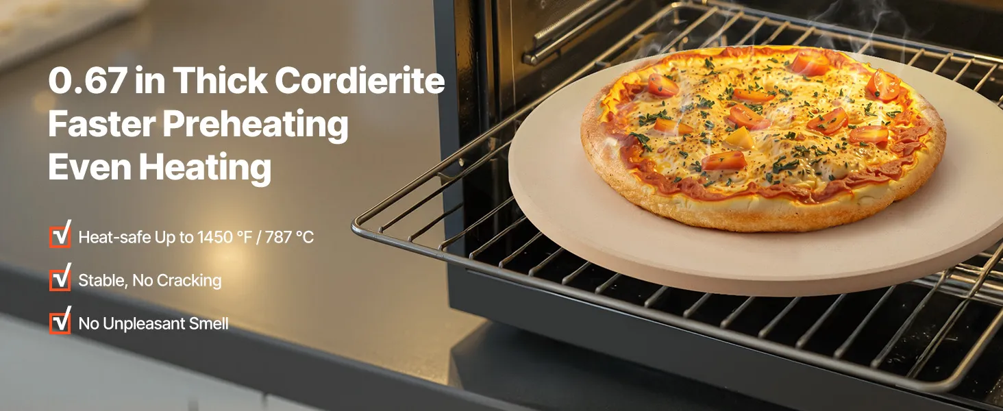 Hittebestendig cordieriet: Onze ronde, 17 mm dikke cordieriet pizzasteen is bestand tegen temperaturen tot 787 °C zonder te kromtrekken of te barsten. Hij houdt de warmte langer vast, waardoor de voorverwarmtijd korter is. Geen onaangename geurtjes tijdens het bakken.
