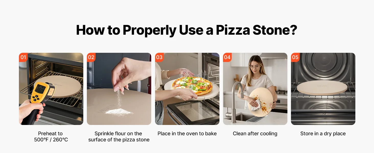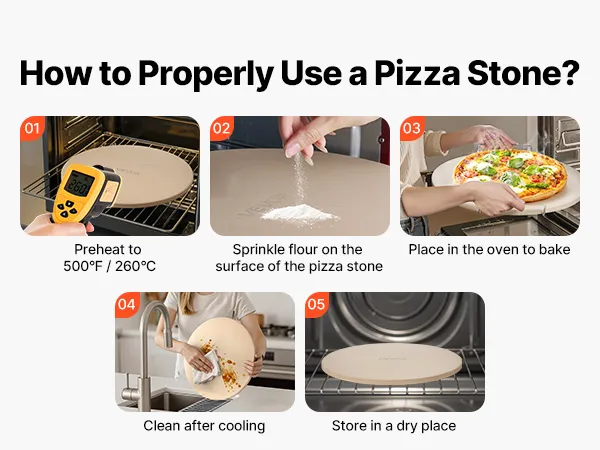 Gemakkelijk schoon te maken: Na afkoeling wast u de cordieriet pizzasteen eenvoudig af met warm water, veegt u hem af met een vochtige doek en droogt u hem af. Bij langdurig gebruik zal het eten dat erop wordt bereid een intensere smaak ontwikkelen. Let op: Eerste gebruik: Maak hem eerst schoon en droog hem af en verwarm hem vervolgens langzaam om de levensduur te verlengen.