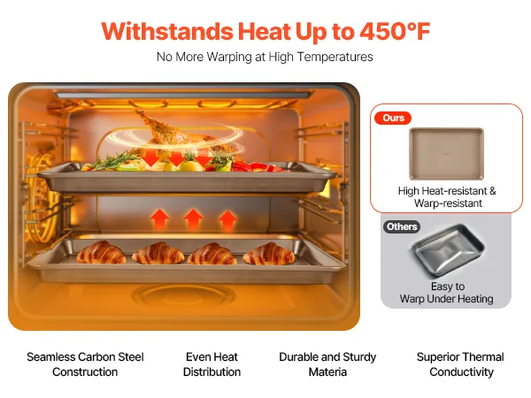 Crafted from premium carbon steel, these baking pans ensure superior heat conductivity and long-lasting durability. With an impressive heat resistance of up to 450℉, they provide even heat distribution, avoiding warping or cracking even at high temperatures. Ideal for all your baking adventures!