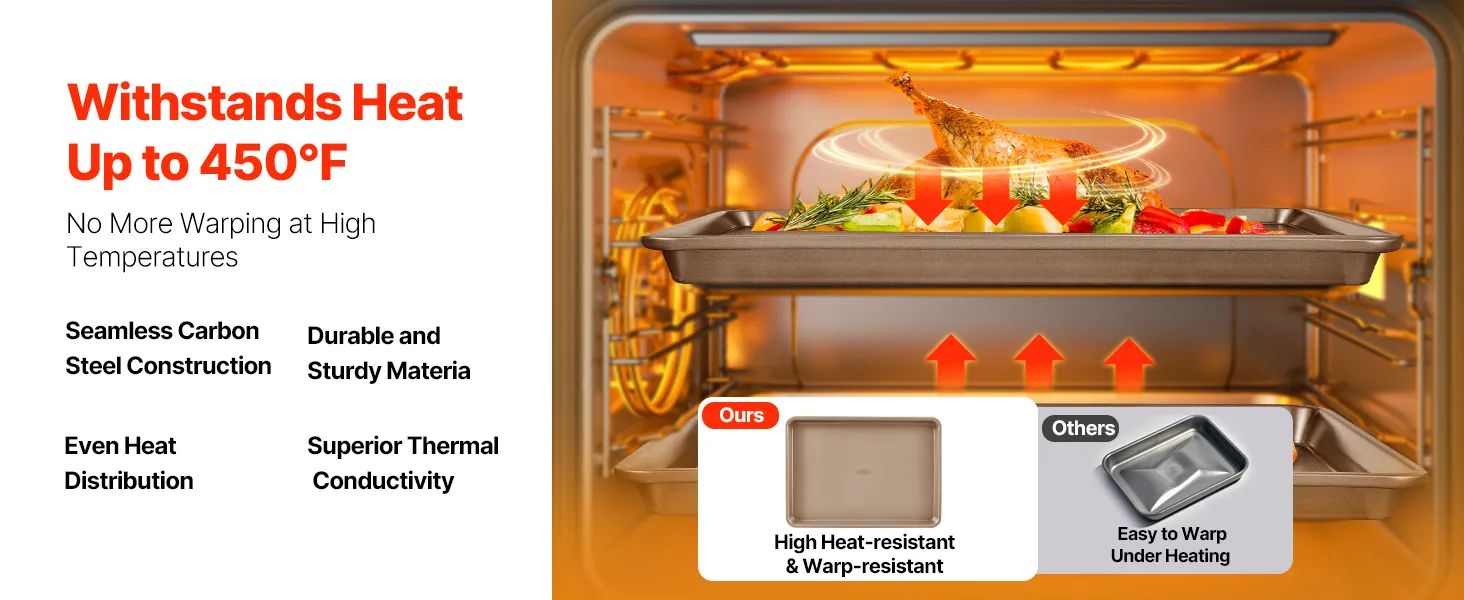 • Remarkable Heat Resistance: Crafted from premium 0.8 mm thick carbon steel—double the thickness of standard bakeware—these durable oven trays are built for stability, even heat distribution, and years of reliable use. They are engineered to resist warping and peeling even, even under high heat up to 450℉, ensuring flawless baking results every time!