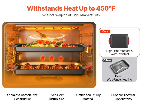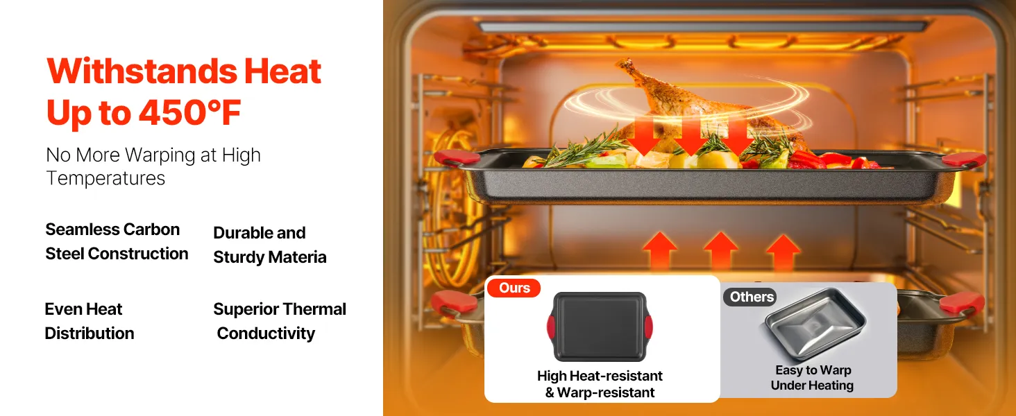 Crafted from premium carbon steel, these baking pans ensure superior heat conductivity and long-lasting durability. With an impressive heat resistance of up to 450℉, they provide even heat distribution, avoiding warping or cracking even at high temperatures. Ideal for all your baking adventures!