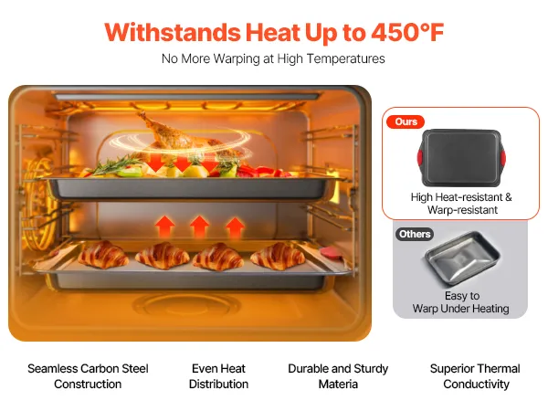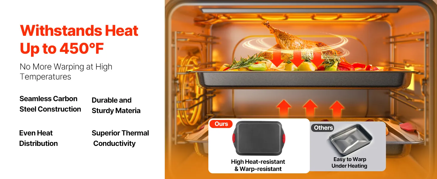 Crafted from premium carbon steel, these baking pans ensure superior heat conductivity and long-lasting durability. With an impressive heat resistance of up to 450℉, they provide even heat distribution, avoiding warping or cracking even at high temperatures. Ideal for all your baking adventures!