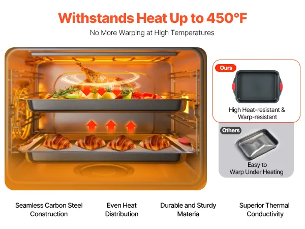 Opmerkelijke hittebestendigheid: Deze bakvormen zijn gemaakt van hoogwaardig koolstofstaal en bieden een uitzonderlijke thermische geleidbaarheid en een lange levensduur tot 232 °C (450 ℉). Ze zorgen voor een gelijkmatige warmteverdeling voor perfect gebakken lekkernijen, zonder dat u zich zorgen hoeft te maken over kromtrekken of barsten. Betrouwbaar, robuust en ontworpen om elke bakervaring moeiteloos tot een succes te maken.