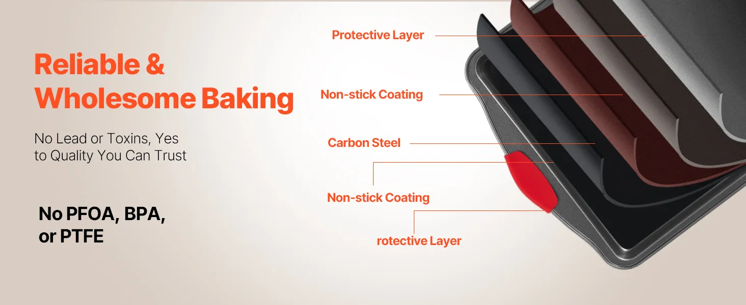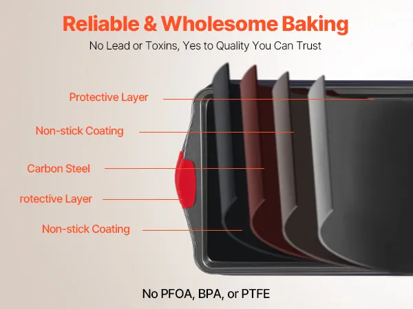 Betrouwbaar en uitstekend materiaal: deze bakplatenset is gemaakt van krasbestendige, vlekbestendige en corrosiebestendige materialen en bevat geen PFOA, BPA en PTFE. Geniet van betrouwbare prestaties, iedere keer dat u het gebruikt. Ideaal voor uw bakplaten, bakvormen en meer.