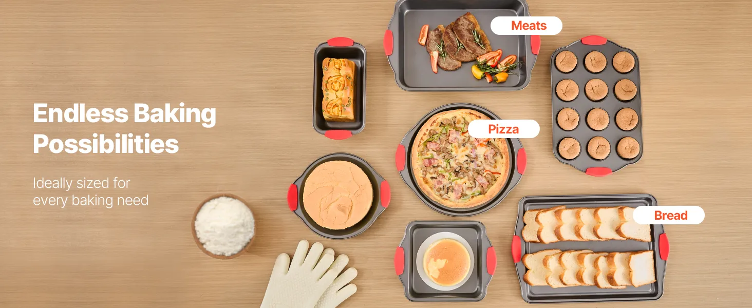 Kies uit verschillende bakvormen in verschillende formaten, passend bij elke behoefte. De kleine bakvorm is ideaal voor het bakken van koekjes, de middelgrote is geweldig voor cakes en de grote is ideaal voor het bakken van vlees en groenten. Met één set vervult u al uw bakwensen.