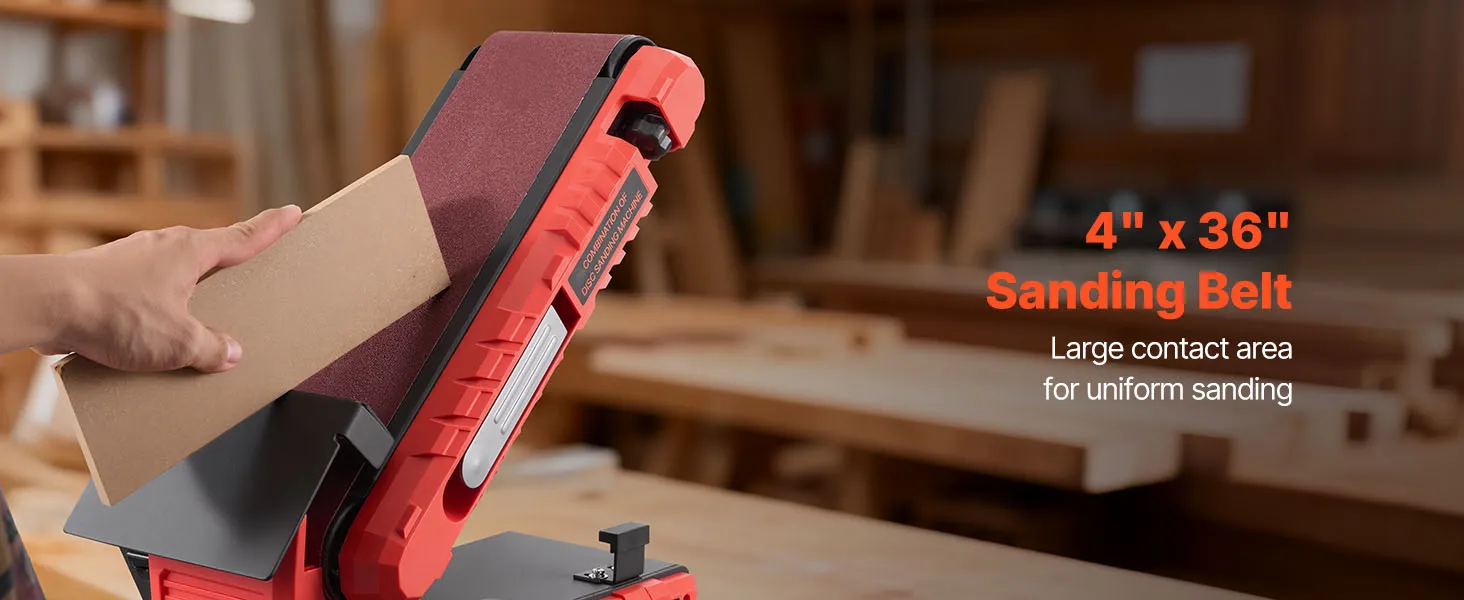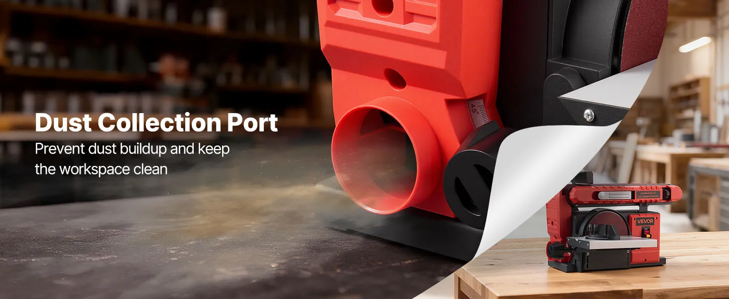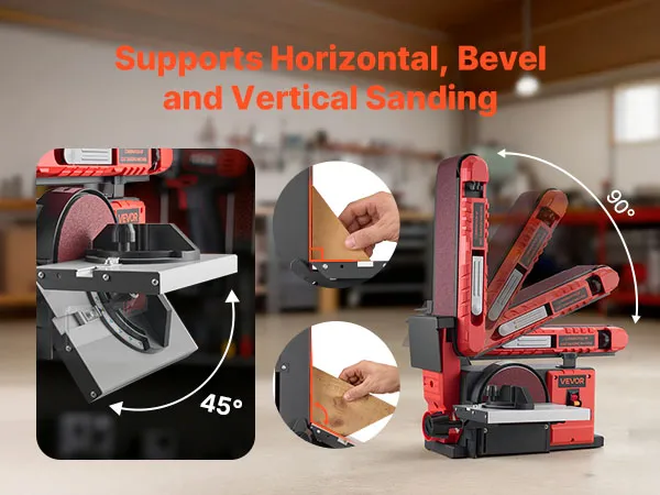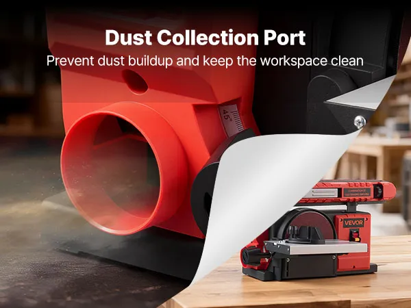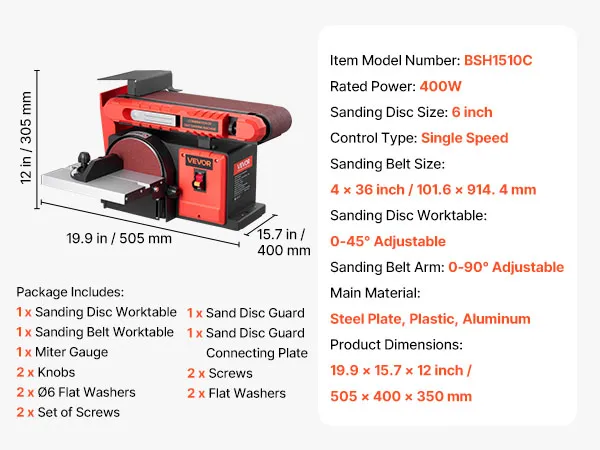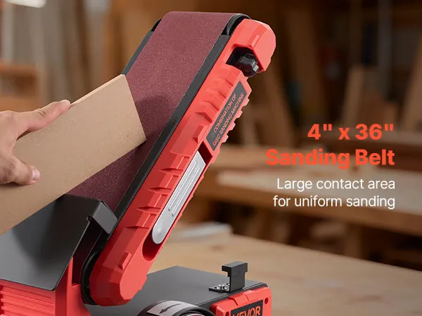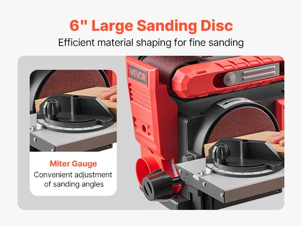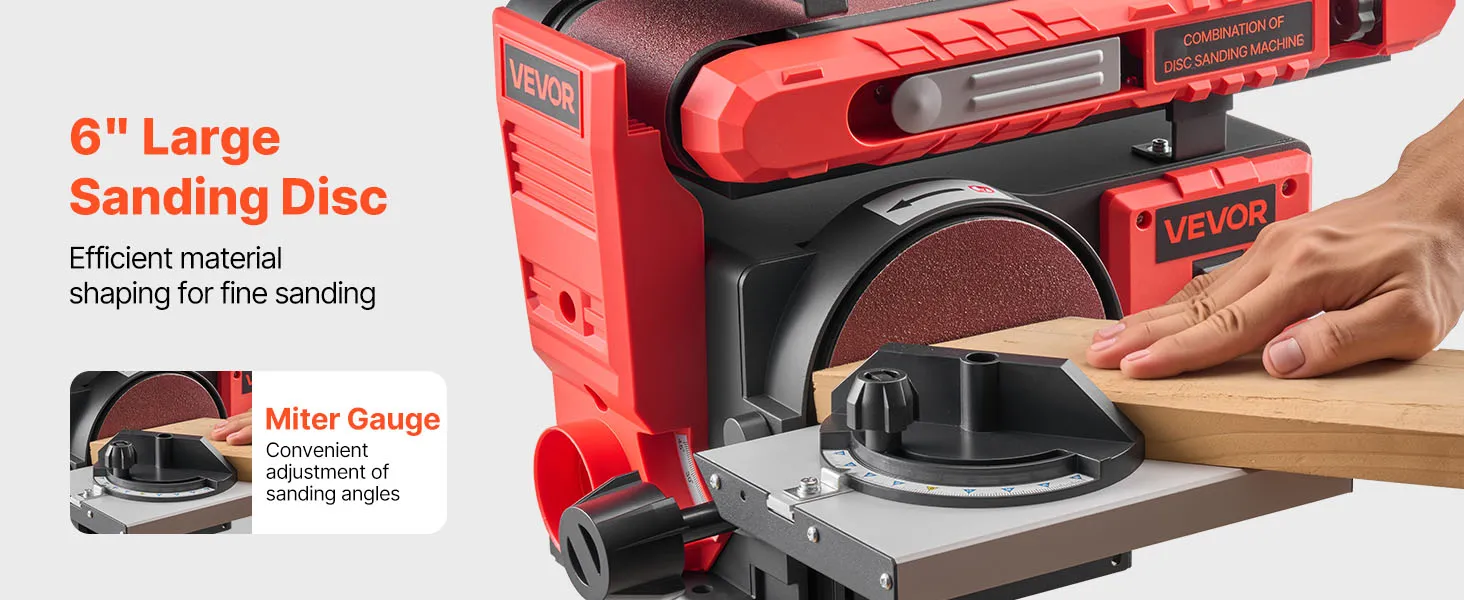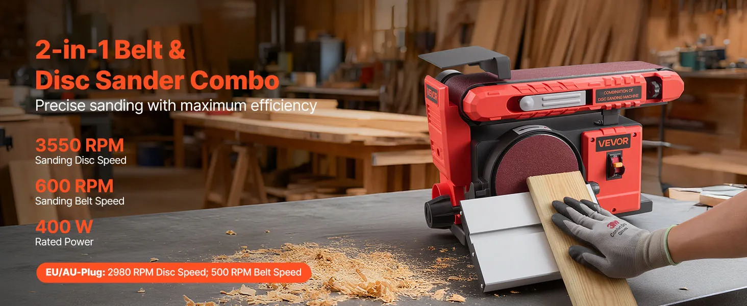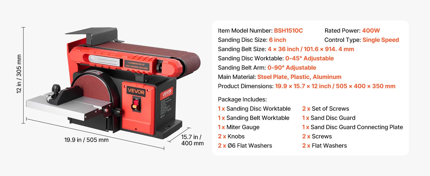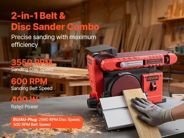 Efficiënt schuren: De VEVOR 152,4 mm (6 inch) schijfschuurmachine en 101,6 x 914,4 mm (4 x 36 inch) bandschuurmachine worden aangedreven door een 400 W motor. De schuurschijf draait met 2980 tpm en de schuurband met 500 tpm, wat zorgt voor het benodigde vermogen voor efficiënt schuren.