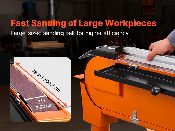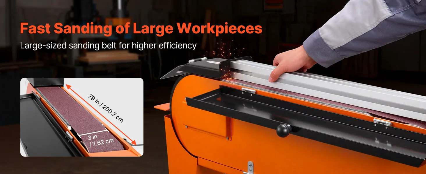 Aangedreven door een krachtige 2100W-motor met een toerental van 900 RPM, levert onze bandschuurmachine van 7,62 x 200,7 cm (3 x 79 inch) een sterk koppel voor veeleisende hout- en metaalbewerkingstoepassingen. De instelbare schuurarm (0–45°) maakt flexibel horizontaal of schuin schuren mogelijk, en de extra brede schuurband zorgt voor snelle materiaalafvoer op grote oppervlakken.