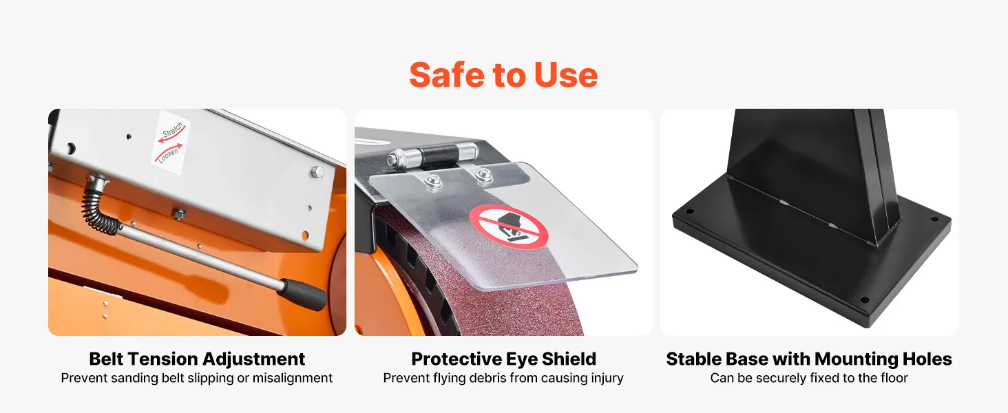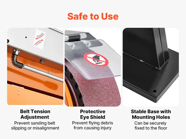 De machine is voorzien van een verstelbare riemspanning om slippen of verkeerde uitlijning te voorkomen, een oogbescherming tegen rondvliegende vonken en splinters, en een versterkte basis om de machine stabiel te houden tijdens gebruik, wat een veilige werkomgeving garandeert.