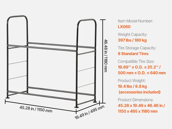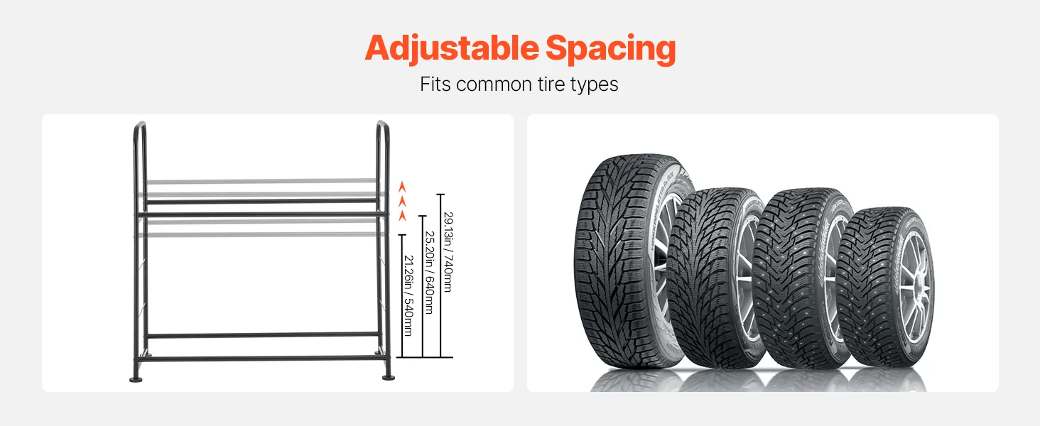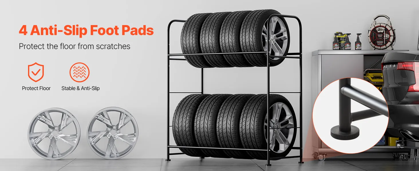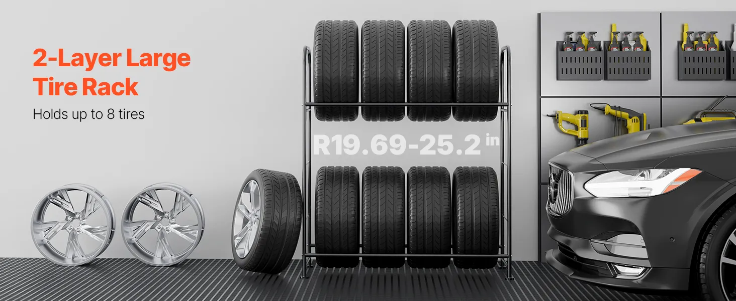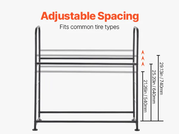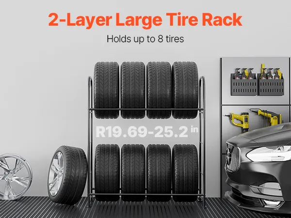 Maximize Your Space: Featuring a 2-layer design, this adjustable tire rack provides ample space to store up to 8 standard tires. It keeps your tires neatly organized, maximizing your storage area and ensuring a tidy garage or workshop.