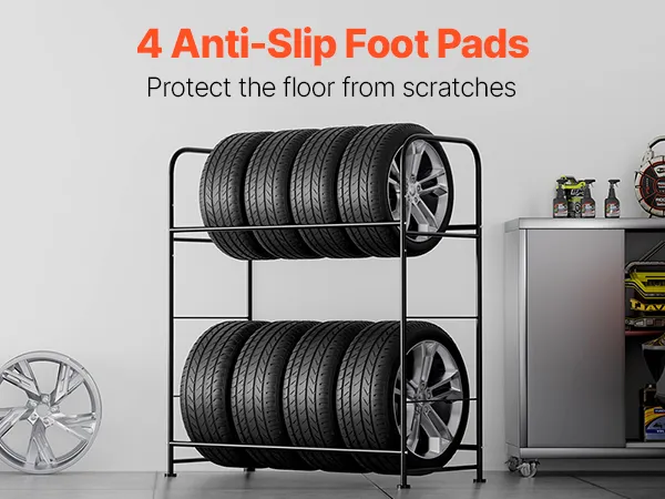 This tire storage stand features 4 anti-slip foot pads for added stability. It comes with the necessary assembly accessories and easy-to-follow instructions for quick setup.