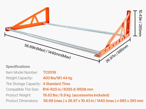 Featuring extendable support bars adjustable from 31 to 56 inches, this tire storage rack can hold up to 4 standard tires off the ground. Compatible with R14-R20 inch tires, it offers a flexible storage solution for your garage or workshop.