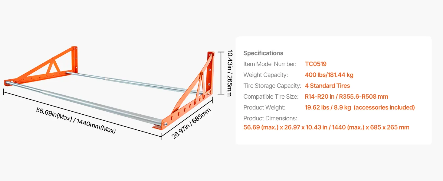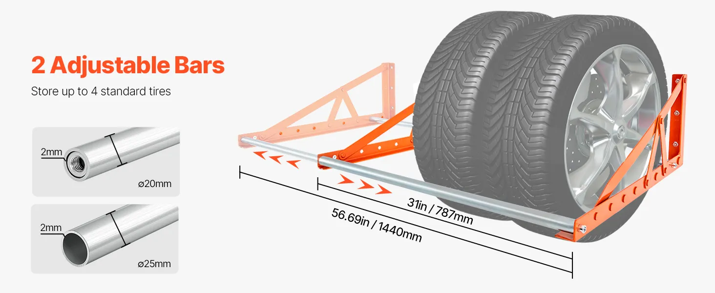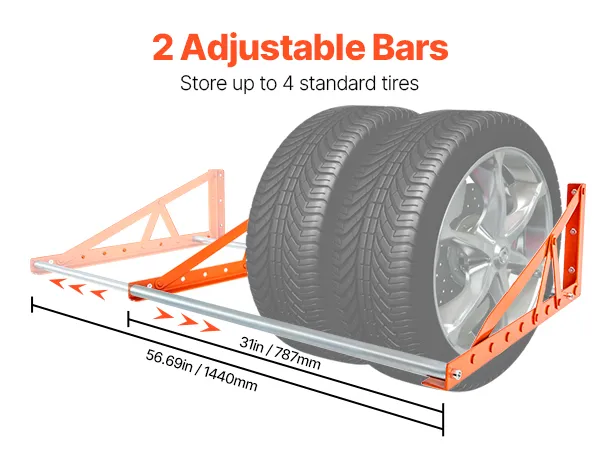 Flexible Length Adjustment: The adjustable support bars of this wall-mounted tire rack easily extend from 31-inch to 56-inch, adapting to various wall sizes and meeting your different storage needs.